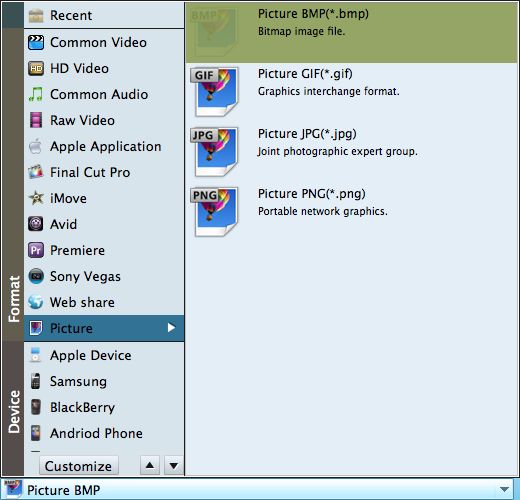 As mentioned before, this SWF to GIF Converter provides many other image formats for choice. Now that we would like to extract image from SWF and save as GIF format, we should choose "Picture"-"Picture GIF(*gif)" as the output format.